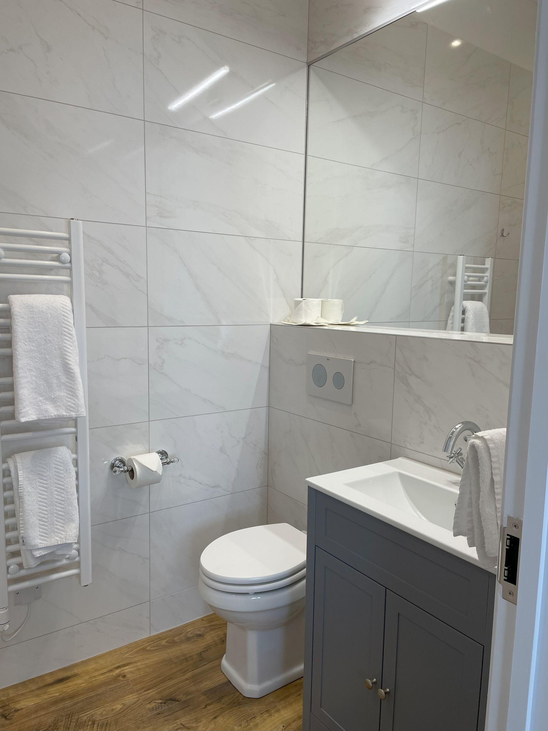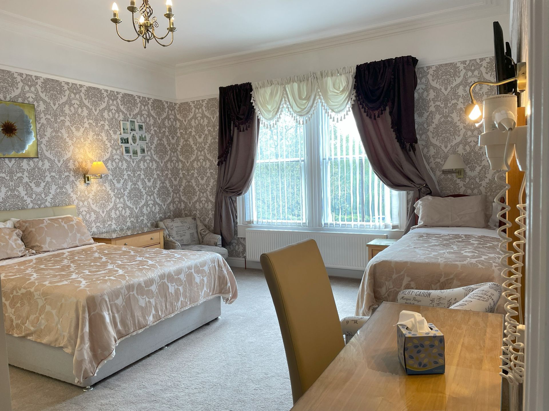 Large family room for 3 people with 1 x king size bed and 1 x single bed and small en-suite shower.